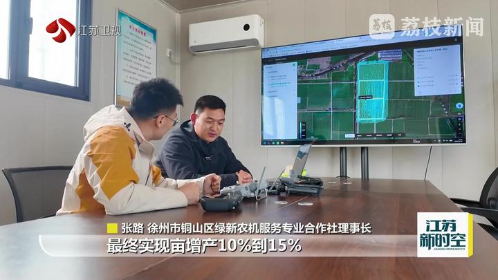 荔枝新闻中心记者郝朦说:“这里是徐州铜山的黄集镇。田管施肥前,飞手们会利用我手中的航测无人机对整个大田进行航拍作业,收集小麦多光谱影像,经过图像分析精细捕捉不同田块小麦长势,再把相关数据导入到植保机当中进行变量施肥,缺多少补多少,甚至有可能不施,来达到节本增效的目的。”