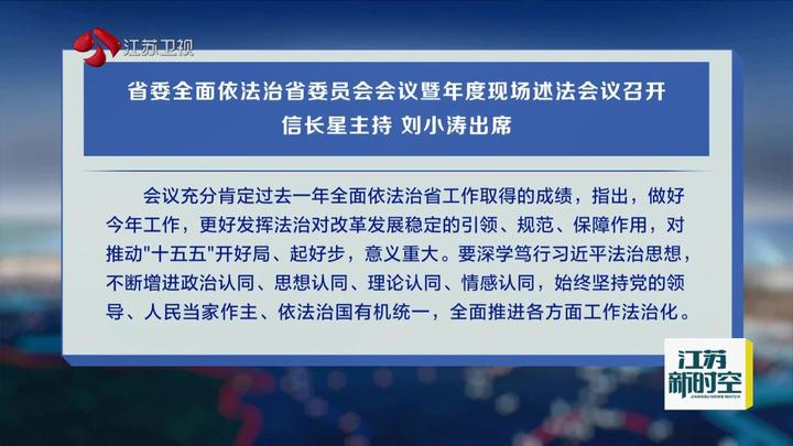 3月26日,省委全面依法治省委员会会议暨年度现场述法会议召开,深入学习贯彻习近平法治思想和习近平总书记对江苏工作重要讲话精神,贯彻落实中央全面依法治国工作会议精神,研究部署今年全面依法治省工作任务,并开展现场述法。省委书记、省委全面依法治省委员会主任信长星主持会议并讲话。省长、省委全面依法治省委员会副主任刘小涛出席会议。