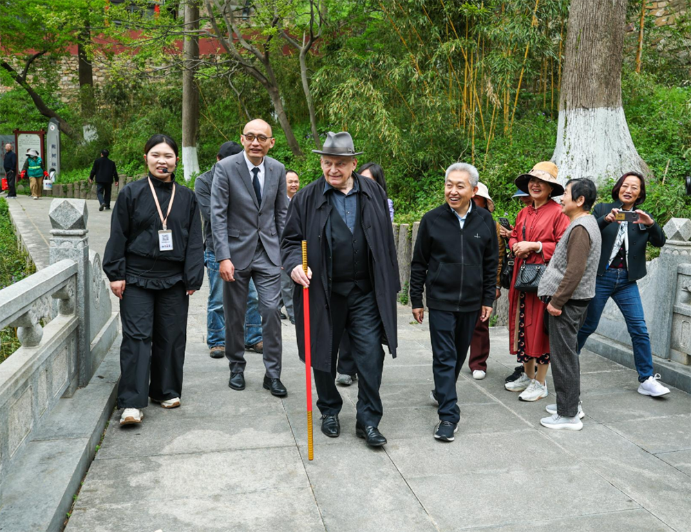 在三元宫,他看着宋代古柏,聆听这座始建于唐代的古建筑群的历史故事;在阿育王塔,他高仰着头,细细抚摸这座千年古塔背后的斑驳砖石,惊叹于巧夺天工与神话传说的奇妙交融,四处腾挪的小猴子引得他频频发笑。随行翻译告诉笔者,洛朗一路上,不断用“神奇”“美妙”“不可思议”形容眼前的一切,字里行间满是对西游文化发源地的由衷喜爱。情到深处,他还掏出手机,向众人展示舞剧中设计的“西游”服装,“60年前,我通过文字认识孙悟空、认识花果山,今天,我亲眼见到了真实的大圣故里,感动难以言表。”
