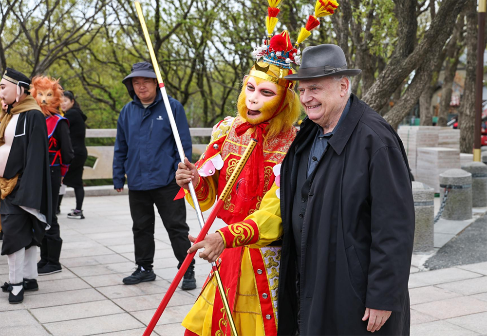 思绪翻飞,将他牵引回花果山巅——玉女峰上,由景区专业演员扮演的师徒四人正在与游客欢快互动,洛朗下车后,第一时间凑上去与“师徒”亲切握手,并从“孙悟空”的手里接过了金箍棒,利利索索地耍了几下,引发现场欢呼;站在海拔624.4米的江苏省最高峰上,他俯瞰连云港城区与黄海碧波相连,忍不住发出赞叹,“这里的迎曙亭、吉祥玉女雕像,包括眼前的壮阔景致,与我年少时在书中构建的神话世界很契合。”他说道。
