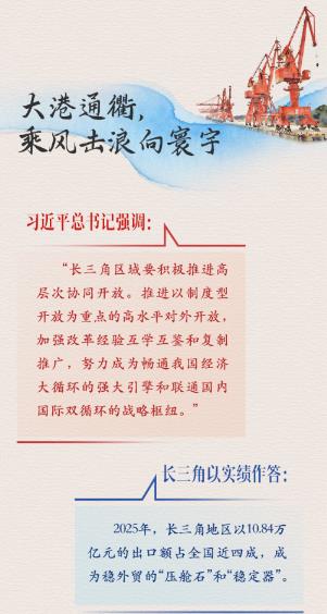 大港通衢处,长三角正驭风浪而笃行。从清晨5时宁波舟山港的钢铁巨臂,到夜晚上海洋山港的智能桥吊,从安徽合肥港派河港驶向欧洲的新能源车队,到江苏苏州太仓港驶向南非的滚装巨轮,长三角港口群昼夜不息。“扩大高水平对外开放,广泛开拓全球市场,更好联通国际循环。”“十五五”开局之年,总书记在今年全国两会上的重要指示言犹在耳。以更高水平对外开放推动高质量发展,长三角地区正在全球贸易版图上书写新的篇章。