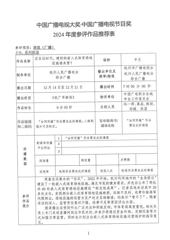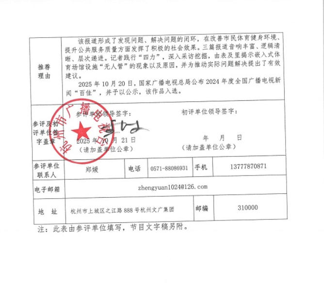 根据相关评奖要求,我单位拟推荐杭州人民广播电台的广播消息(系列报道)《后亚运时代,建好的嵌入式体育场地设施谁来管?》和南京广播电视台的广播专题《“零碳乡村”不等于“穷村”!》参加第四届中国广播电视大奖•中国广播电视节目奖(2024年度)复评,现予公示。公示期:2025年10月22日至2025年10月28日。如有异议,请与委员会秘书处联系。联系电话:025-84561700、18652075407,联系邮箱:cstgbxw@163.com。