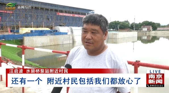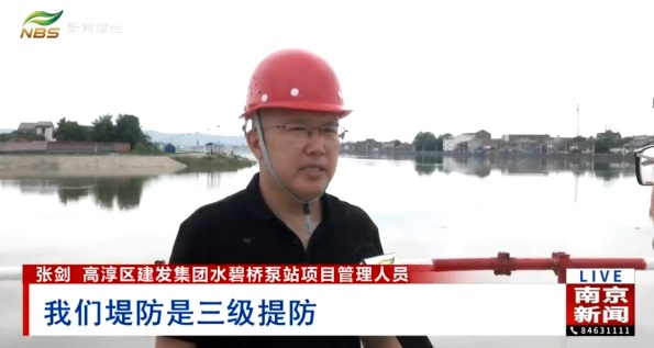 高淳区建发集团水碧桥泵站项目管理人员张剑介绍道:“工程主要包括两个部分,泵是本体,主要功能是抗旱补水,另外一个是提防加固工程。我们提防是三级提防,设计标高是14.7米,我们的保证水位是12.8米,也就是说我们的提防顶高比洪水位置要高出将近两米。”