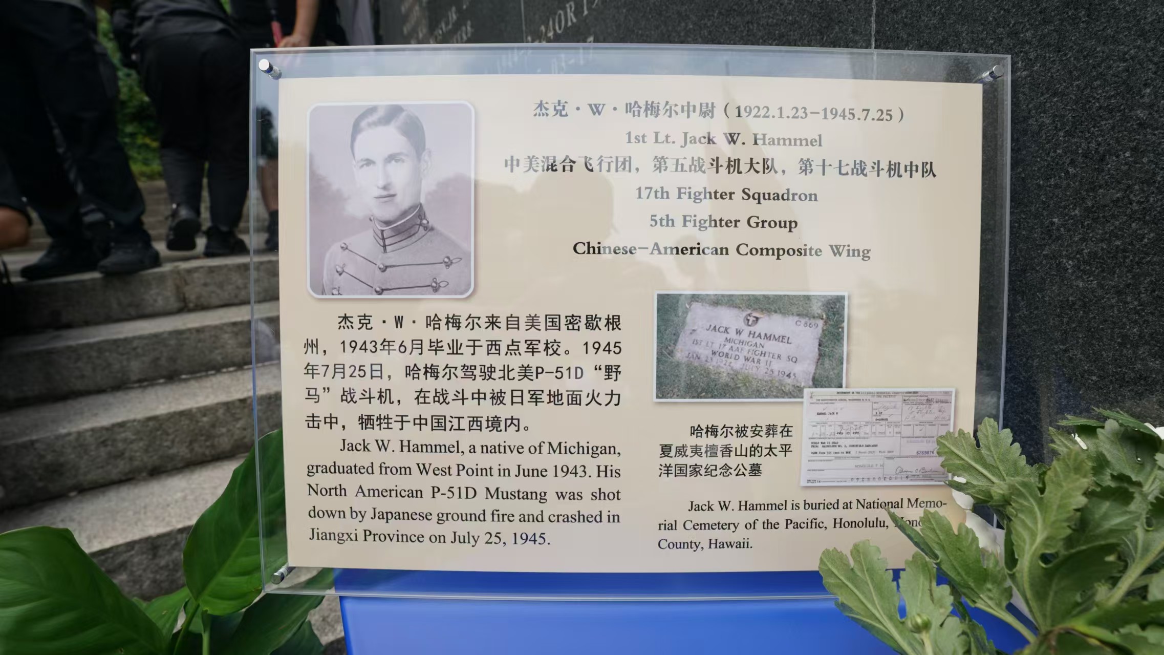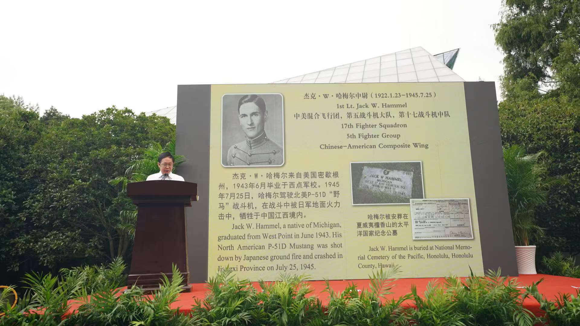 当日,南京抗日航空烈士纪念馆还宣布为1位美国籍在华牺牲飞行员杰克·哈梅尔(JACK W.HAMMEL)中尉补名。哈梅尔于 1943年6月毕业于西点军校,后来华参战,任中美混合飞行团第五战斗机大队第十七战斗机中队飞行员。1945年7月25日,哈梅尔驾驶北美P-51D“野马”战斗机,在战斗中被日军地面火力击中,牺牲于中国江西境内。