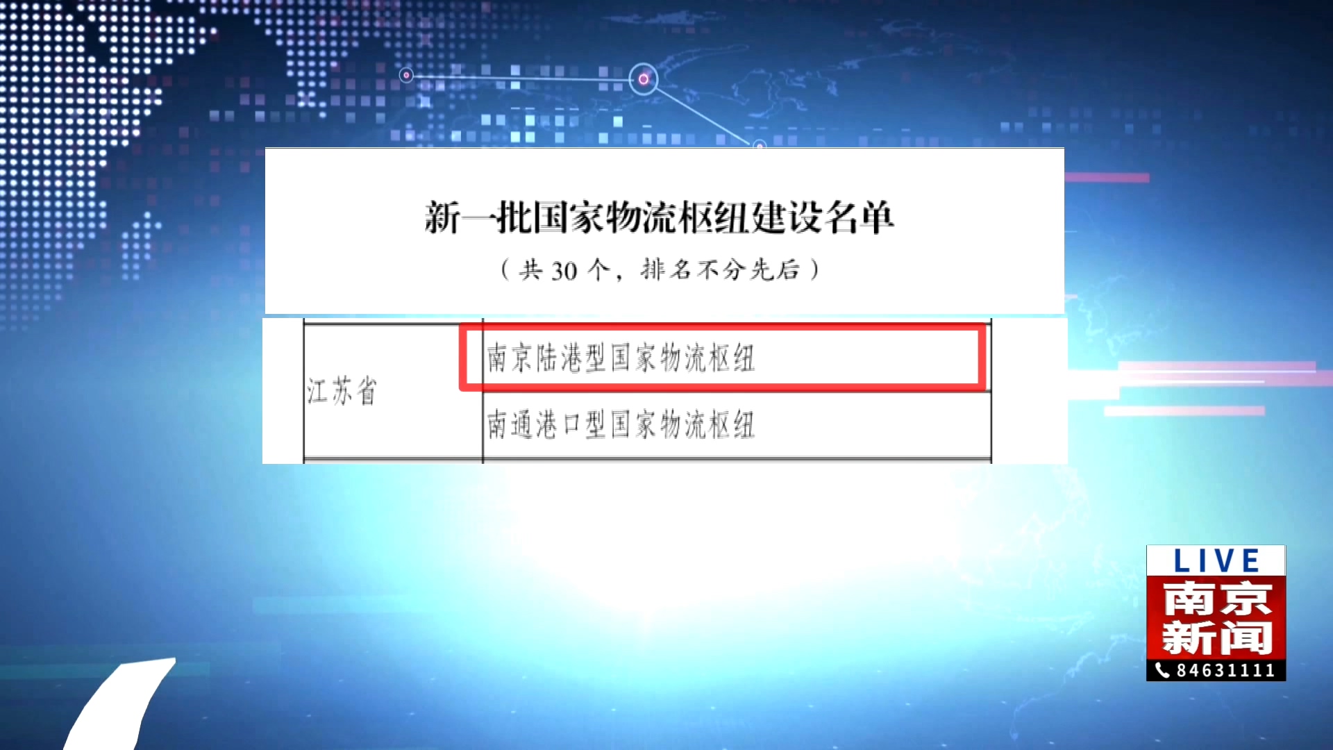 6月23日,记者从市发展改革委获悉,国家发展改革委近日公布2025年国家物流枢纽建设名单,支持新一批30个国家物流枢纽建设。其中,南京陆港型国家物流枢纽入选。