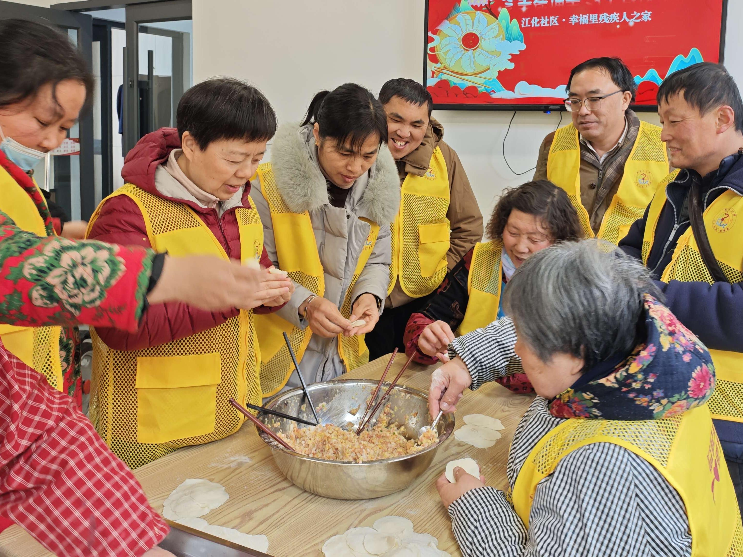 交汇点讯 拓印“福”、包饺子、圆环“套福”……蛇年春节临近,1月16日,连云港市海州区幸福路街道的江化社区·幸福里“残疾人之家”热闹非凡,一场“共享幸福年”活动为20余残障人士及家属送上浓浓的新春祝福。