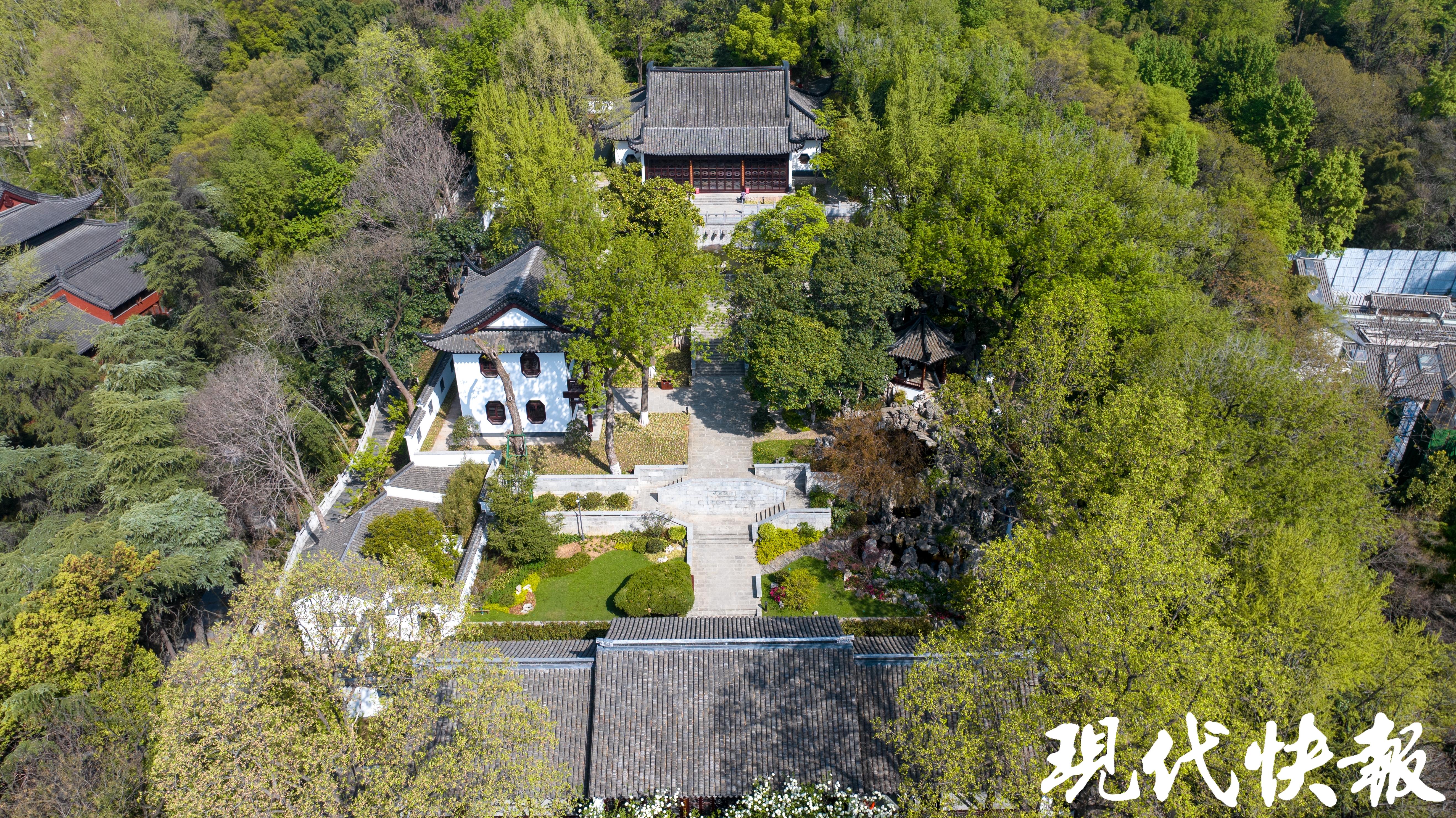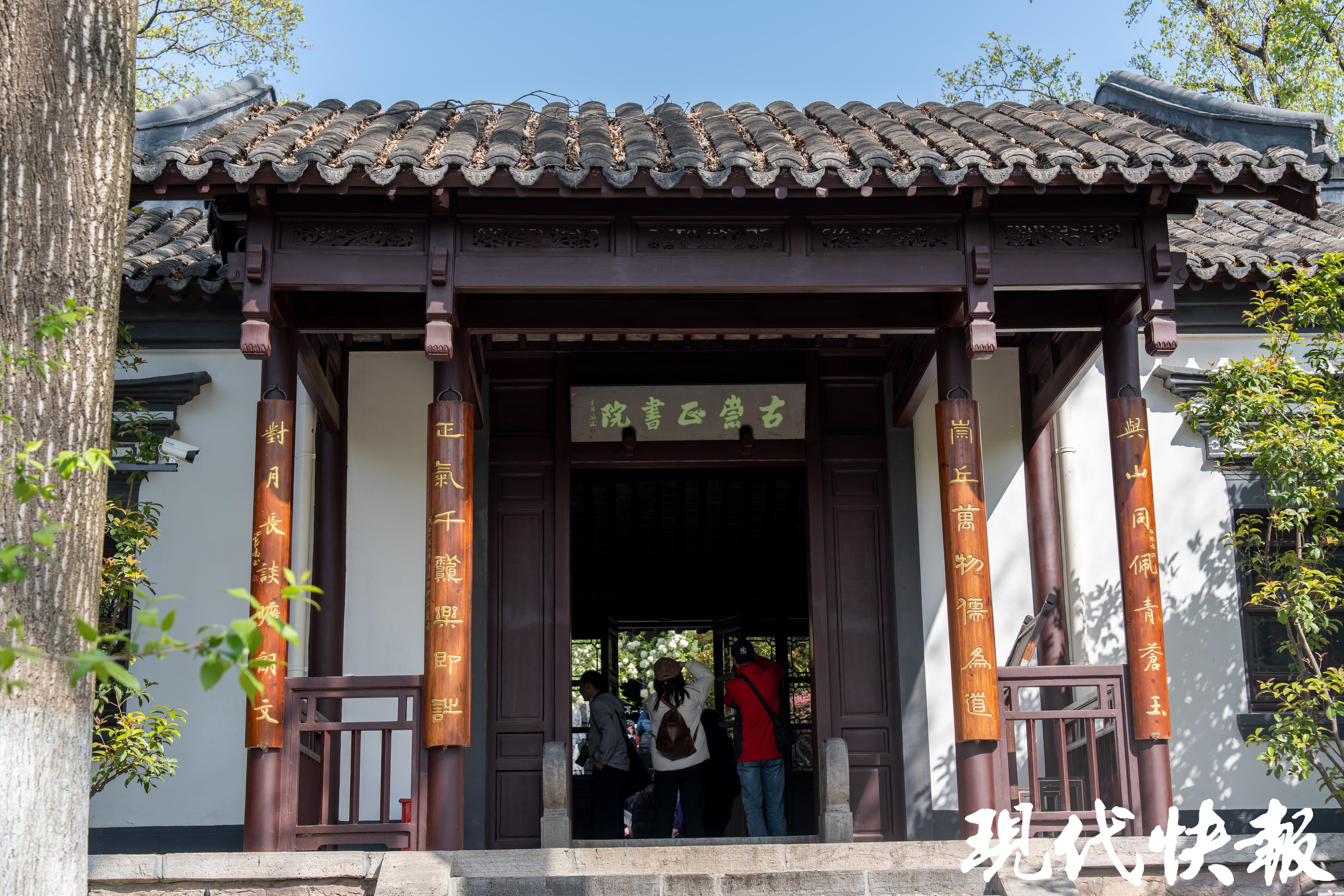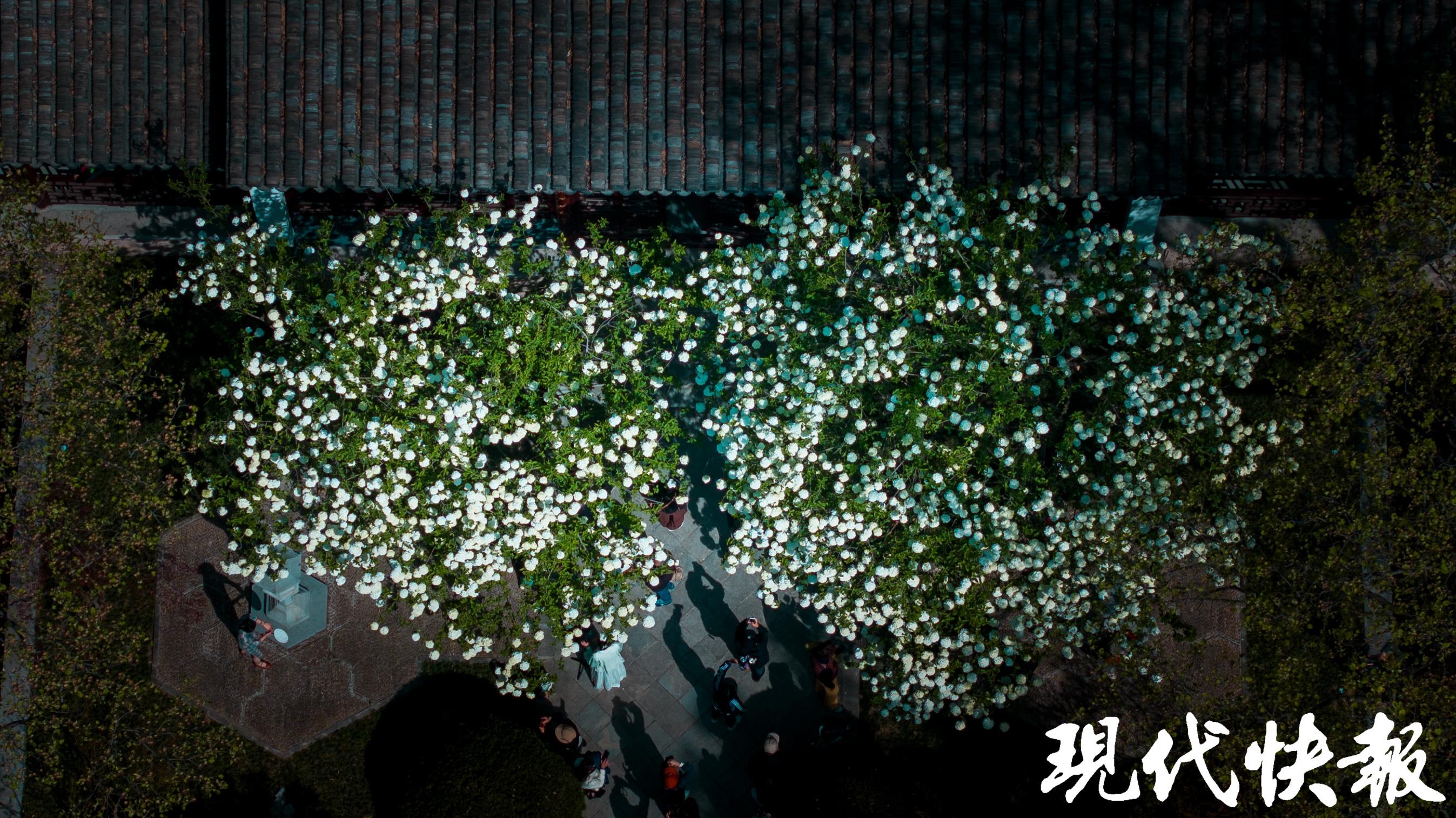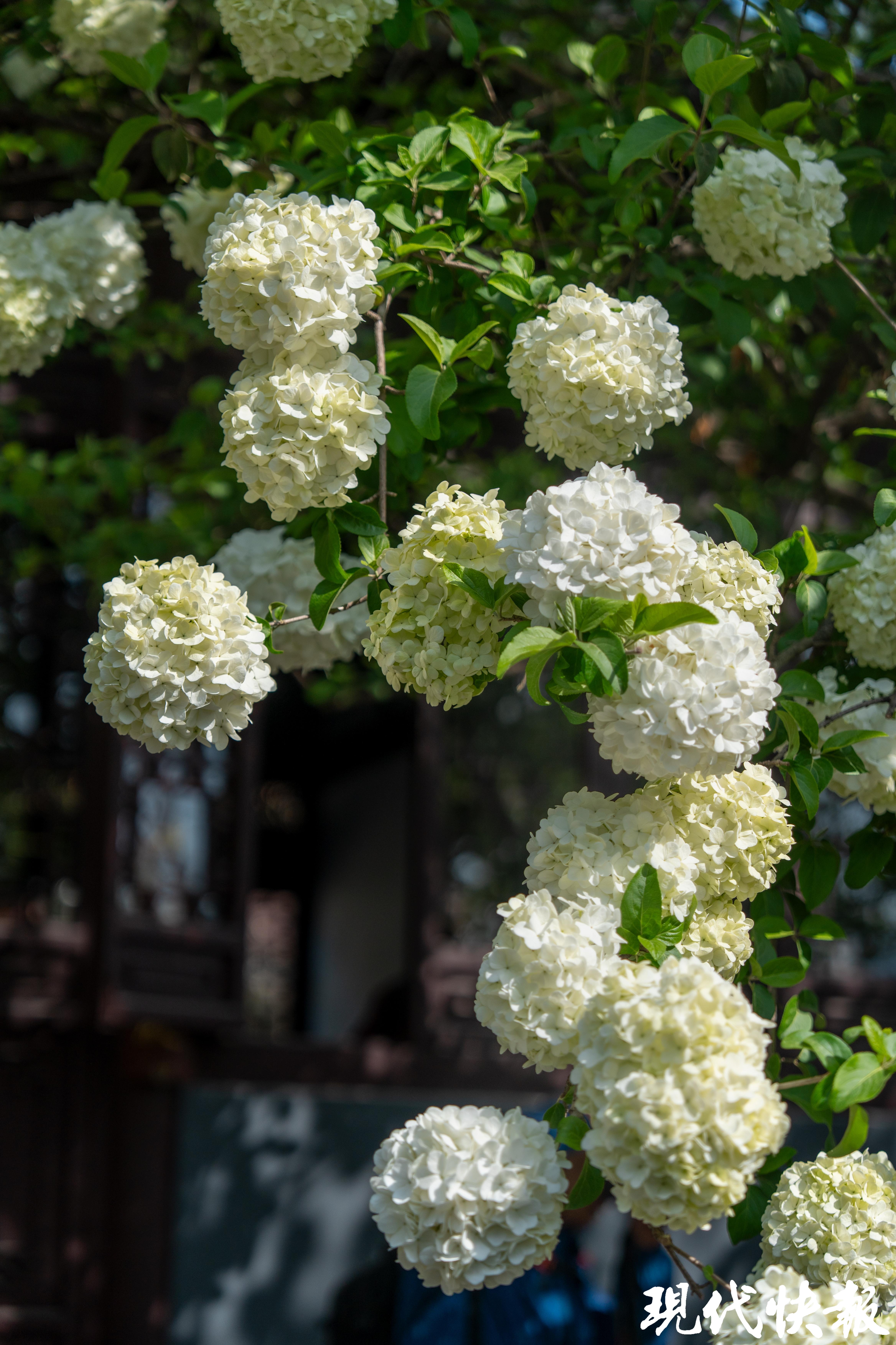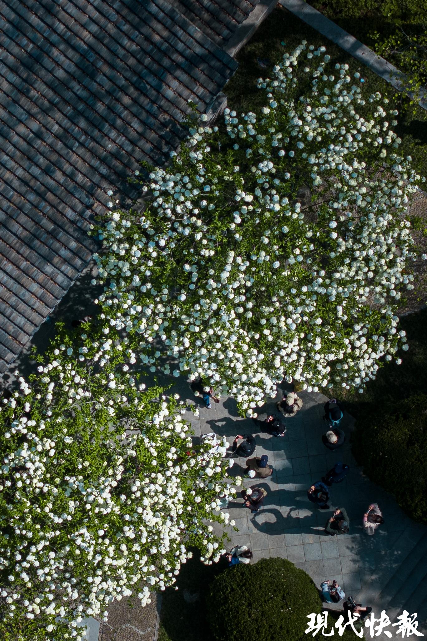 当天上午9点,现代快报记者在现场看到,刚刚开放的崇正书院已经吸引了大批摄影爱好者前来采风。眼下,崇正书院二殿的门口,大朵大朵的木绣球花在枝头绽放,白色的花球尚有一些浅浅的绿色,与古色古香的建筑相辉映,营造出浓浓的书卷气。黛瓦朱梁、花格窗棂就像是天然画框,花开其间宛若一幅丹青水墨。据了解,这样的诗意绣球可持续至4月底。
