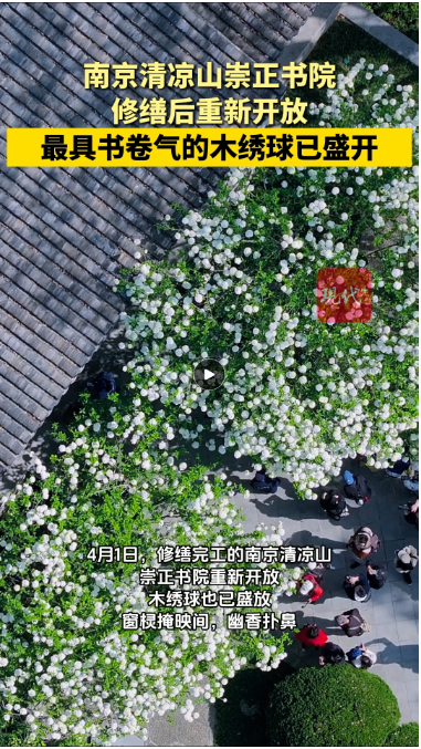 明嘉靖年间,督学御史耿定向在此讲学,建崇正书院,明朝南京第一个状元焦竑曾就读于此。明清两朝,这里几经兴废,1982年,著名建筑家杨廷宝主持规划设计重建崇正书院,同时种下了这两株木绣球,让这里的春天浸润书香,也让这份诗意得以具象。