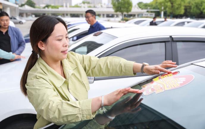 2023年高考期间,江苏省淮安市开展“爱心送考”志愿者服务活动,组织爱心司机在高考期间为考生提供送考服务。这是淮安市一名网约车司机在车辆上张贴“爱心送考”标识。