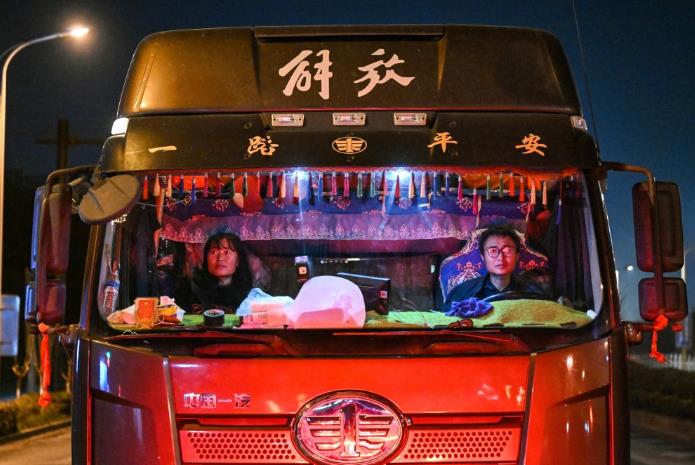 2025年1月13日晚,货车司机孔令建和妻子王艳青驾车行驶在浙江省杭州市的道路上。临近春节,他们通过平台获得一个送货到老家附近的订单,在工作的同时踏上了回家过年的团圆之路。