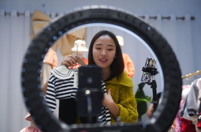 2021年2月8日,浙江省湖州市吴兴区织里镇一家童装电商的工作人员在直播销售童装。
