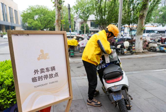 2025年4月22日,在江苏省南京市,商家为外卖员提供车辆临时停放点。2025年,灵活就业和新就业形态劳动者权益保障水平稳步提高:快递、外卖、货运等行业签订集体合同3576份,覆盖平台企业及其合作企业1.32万家;截至2025年11月底职业伤害保障试点累计超2420万人参保。