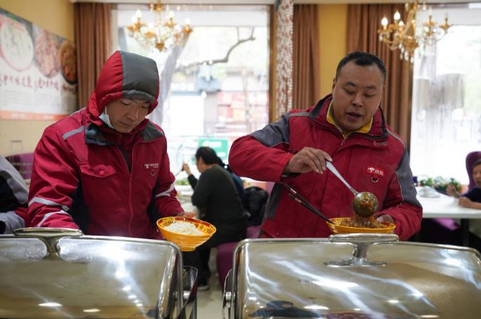 2021年11月7日,两名快递员在北京市东城区小石灶餐厅取餐。该餐厅以优惠价格为快递员提供自助午餐,当地街道工会、商会和企业联合出资补助。