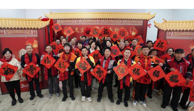 2024年1月16日,在北京的中国职工之家工会驿站举行的万福迎春——2024年“送万福、进万家”书法公益活动上,快递小哥展示福字。