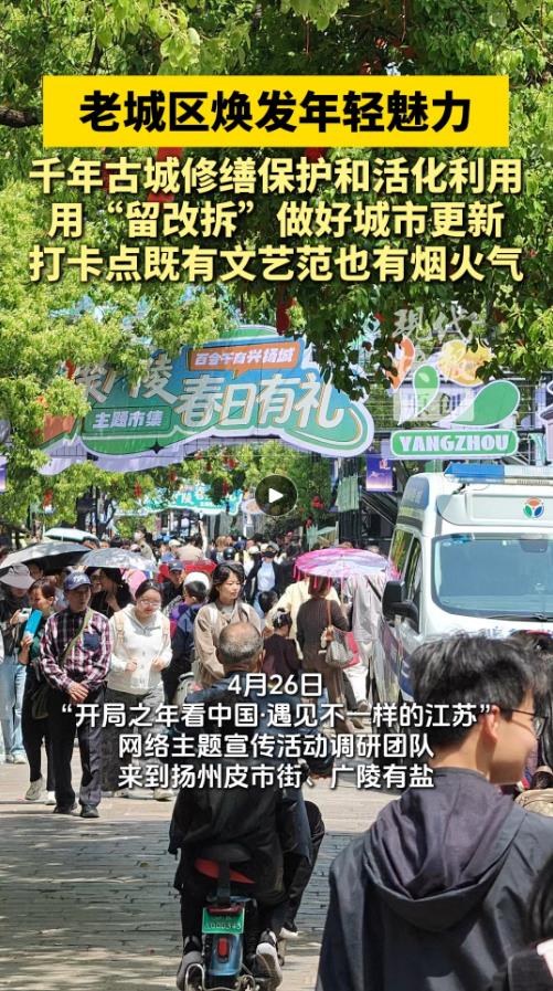 现代快报讯(记者 庄剑翔)千年古城如何焕发新活力?在扬州的老城区,可以找到让人耳目一新的答案。通过更新,这里不但保留了千年风韵,也成为当下年轻人喜爱的“新兴打卡点”。4月26日,“开局之年看中国·遇见不一样的江苏”网络主题宣传活动调研团队来到扬州皮市街、有盐街区,实地感受了这里古城换新颜的独特魅力。